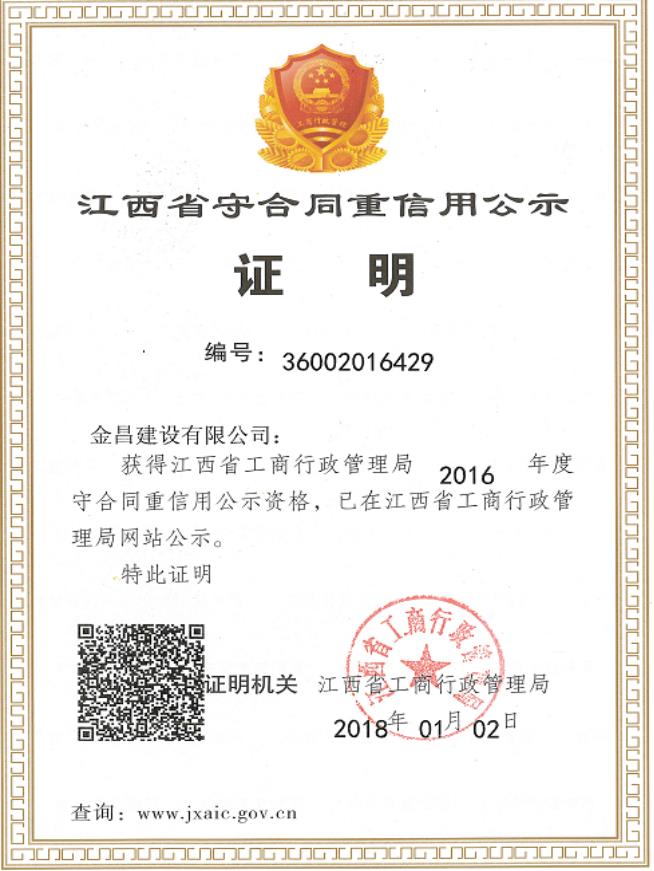 近日,憑借良好的企業(yè)信用,我公司再次榮獲由江西省工商行政管理局頒發(fā)的“2016年度守合同重信用公示”證明。自2007年以來(lái),我公司已連續(xù)12年獲此殊榮。