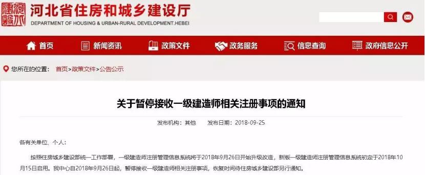 2、9月26日起,暫停接收一級(jí)建造師相關(guān)注冊(cè)事項(xiàng),恢復(fù)時(shí)間待住房城鄉(xiāng)建設(shè)部另行通知。